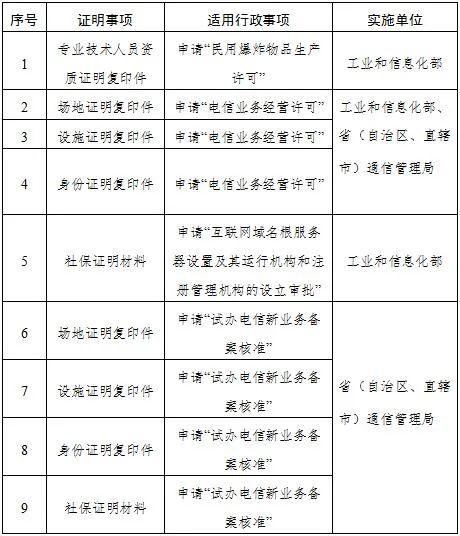 工业和信息化部证明事项告知承诺制实施清单