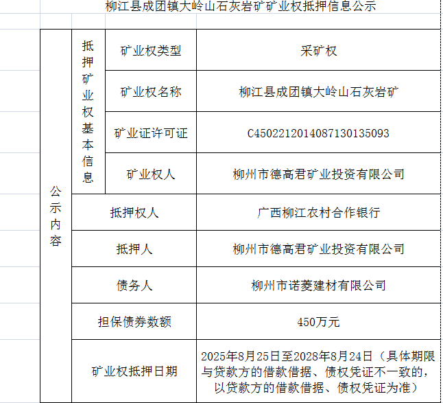 柳江县成团镇大岭山石灰岩矿矿业权抵押信息公示