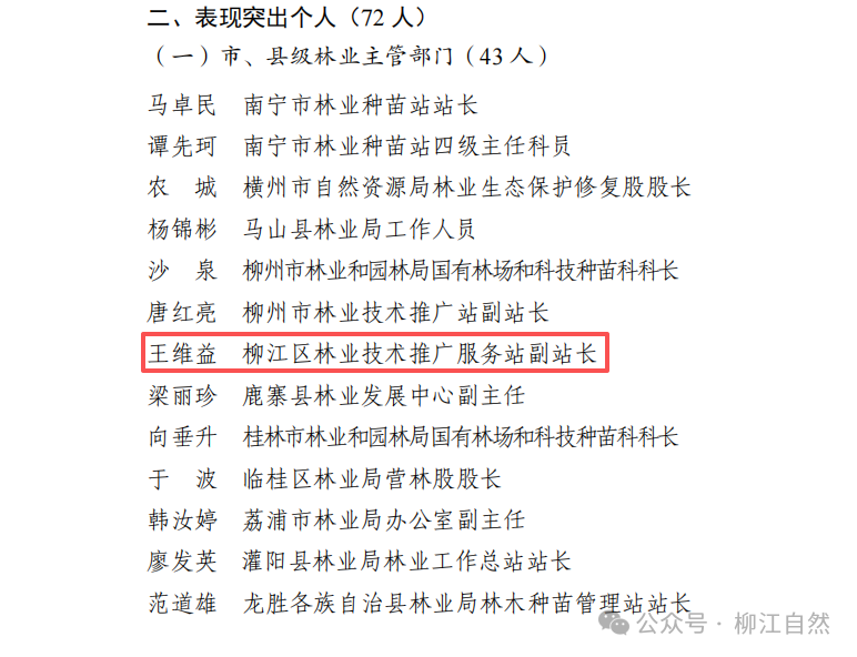 近日,广西壮族自治区林业局对在广西第一次林草种质资源普查与收集工作中表现突出的单位和个人予以通报表扬,我局林业技术推广服务站副站长王维益同志光荣入选,获“工作表现突出个人”奖!
