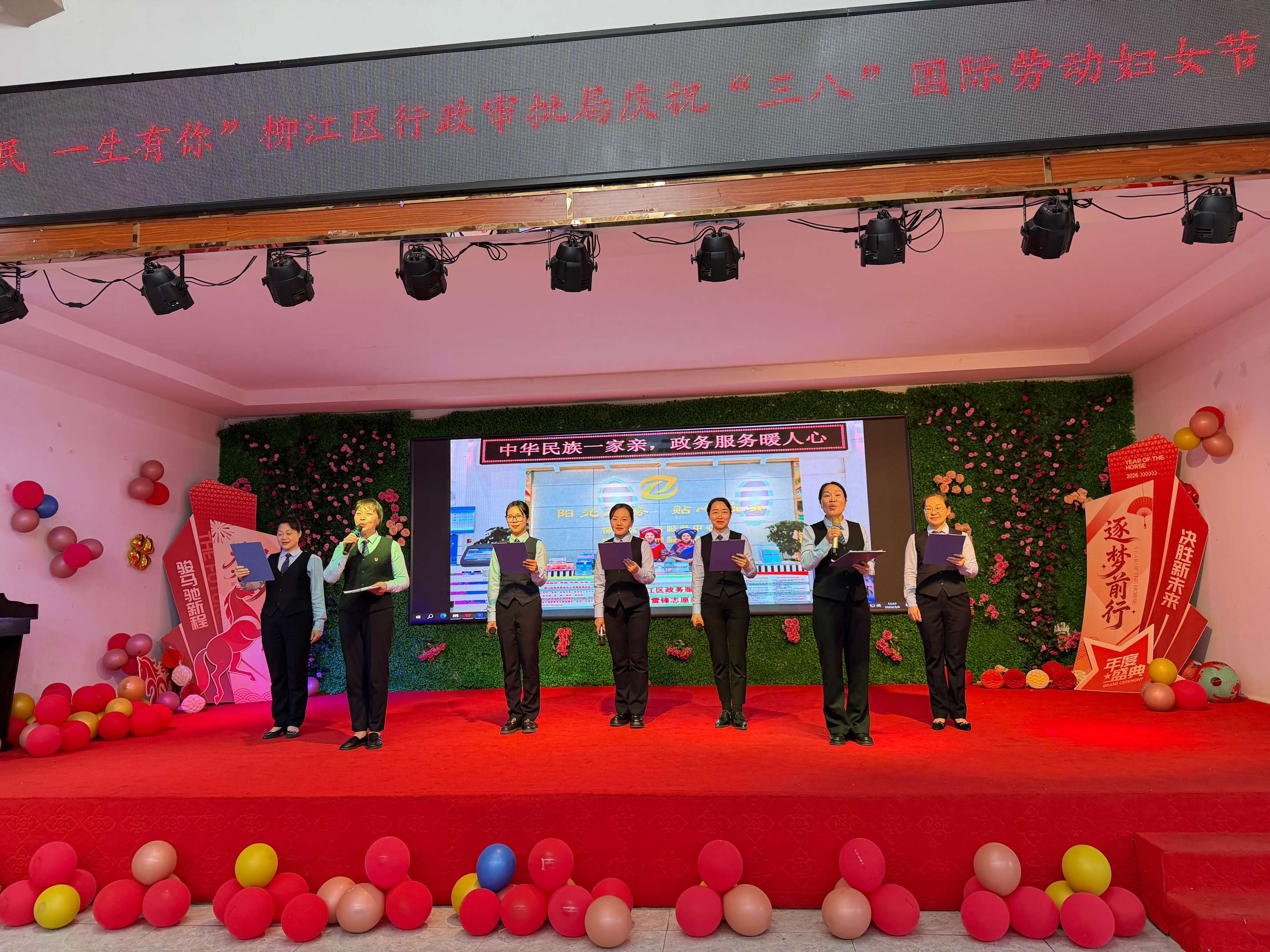局领导班子代表登台合唱《阳光总在风雨后》,用歌声传递敬意。班子成员为全体女同胞逐一送上玫瑰花与节日祝福,现场气氛温馨热烈,掌声不息。