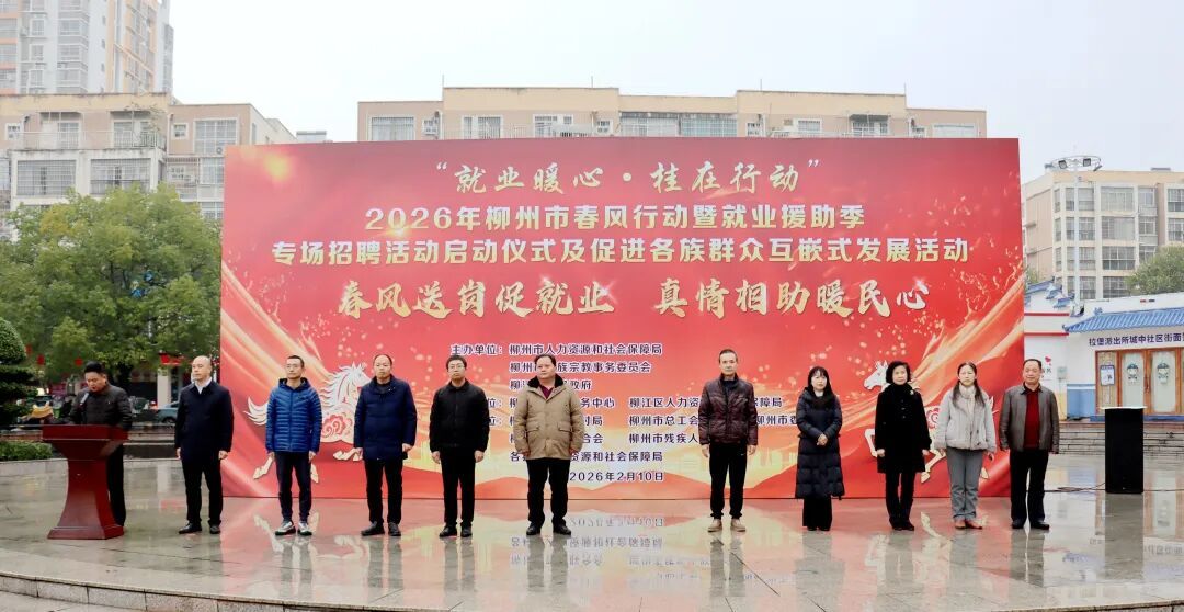 2月10日,由柳州市人力资源和社会保障局、市民族宗教事务委员会、柳江区人民政府联合主办的 “就业暖心・桂在行动”2026 年柳州市春风行动暨就业援助季专场招聘会在柳江区启动,同步开展促进各族群众互嵌式发展活动。