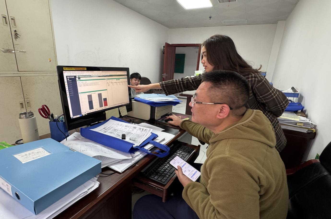 (图为审计人员到区财政局登陆业务管理系统核实保费补贴现场)