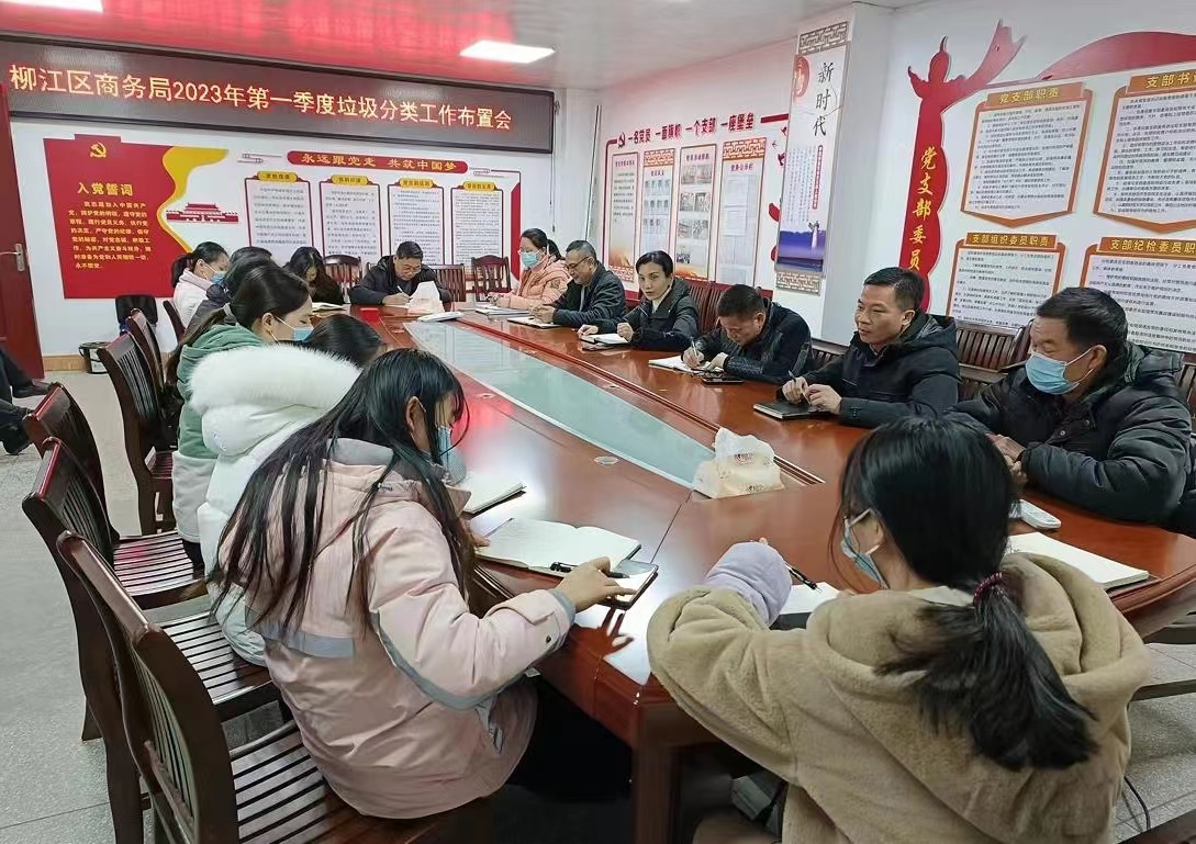 2023年1月19日柳江区商务局全局干部职工在局三楼会议室召开第一季度公共机构生活垃圾分类工作培训会。会议由熊培铁副局长主持,会上他要求全体干部职工要提高认识,统一思想,不断提高生活垃圾分类的主动性和自觉性,不断提升机关干部职工的生活垃圾分类意识和习惯。树立“垃圾分类,从我做起观念”,把垃圾分类当成我们责无旁贷的责任,自觉在工作和生活中养成垃圾分类投放的良好习惯,用自己的模范行为带动身边人,形成人人有责、人人参与、人人受益的良好氛围。从现在做起,做好有害垃圾、可回收物、厨余垃圾、其他垃圾的分类收集、准确投放,让垃圾分类走进我们的生活。