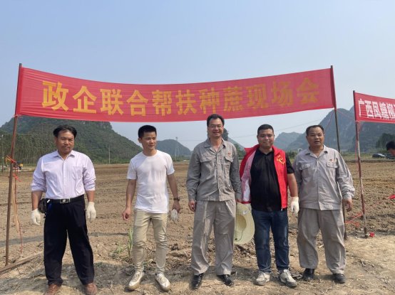 柳江区糖业中心主任陈康志(右2)、百朋镇政府武装部长刘文涛(左2)、柳江制糖公司总经理邬启兵(右3)副总经理韦新海(右1)在帮扶种植现场。