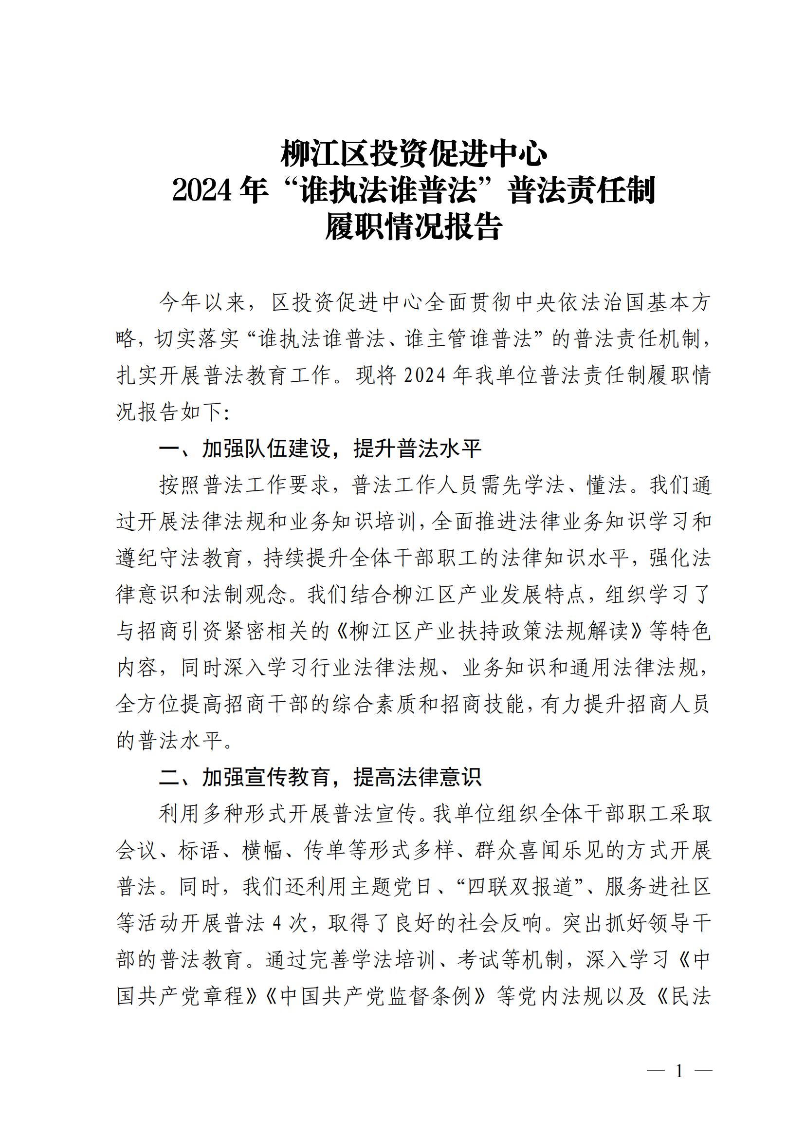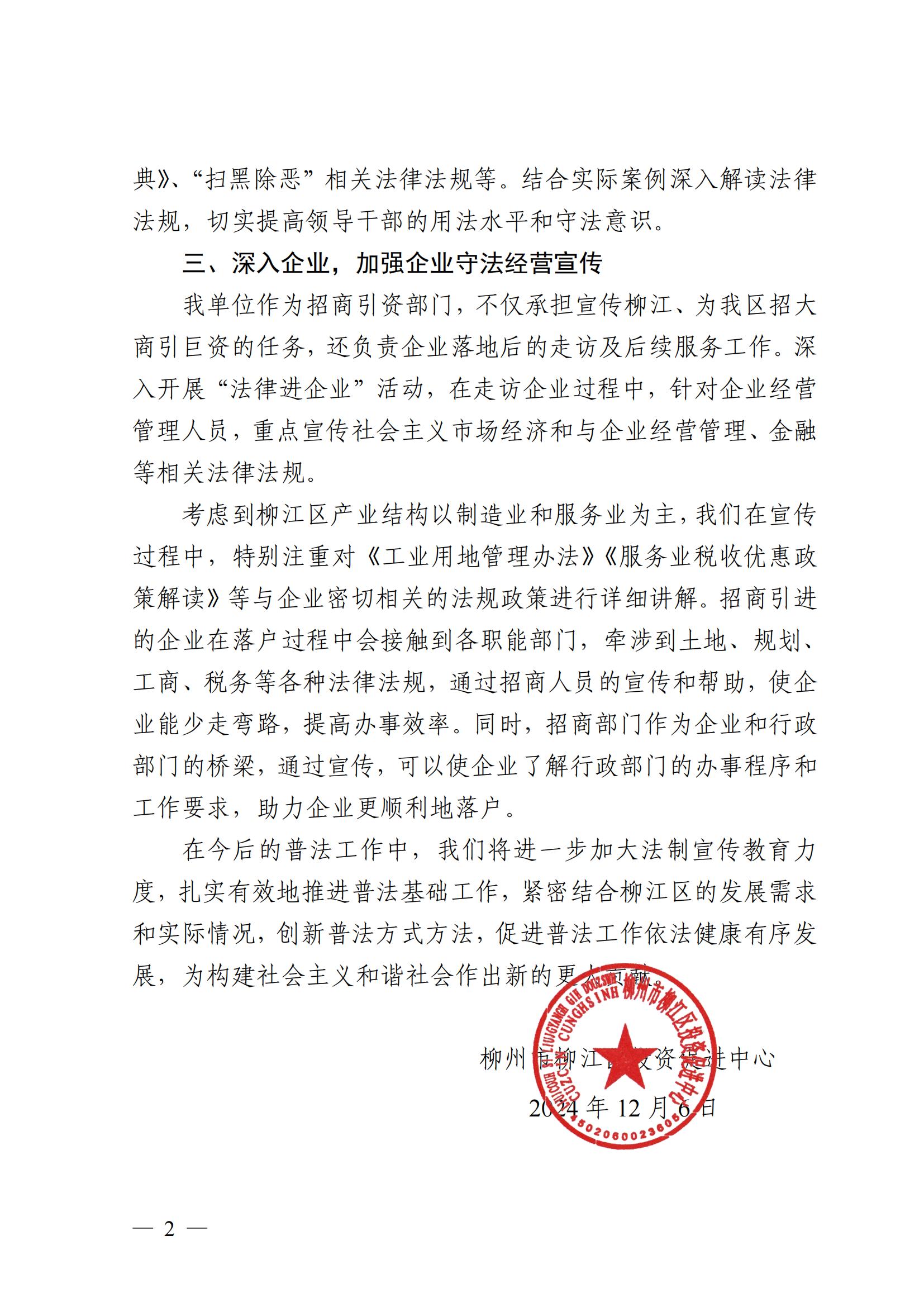 柳江区投资促进中心2024年“谁执法谁普法”普法责任制履职情况报告