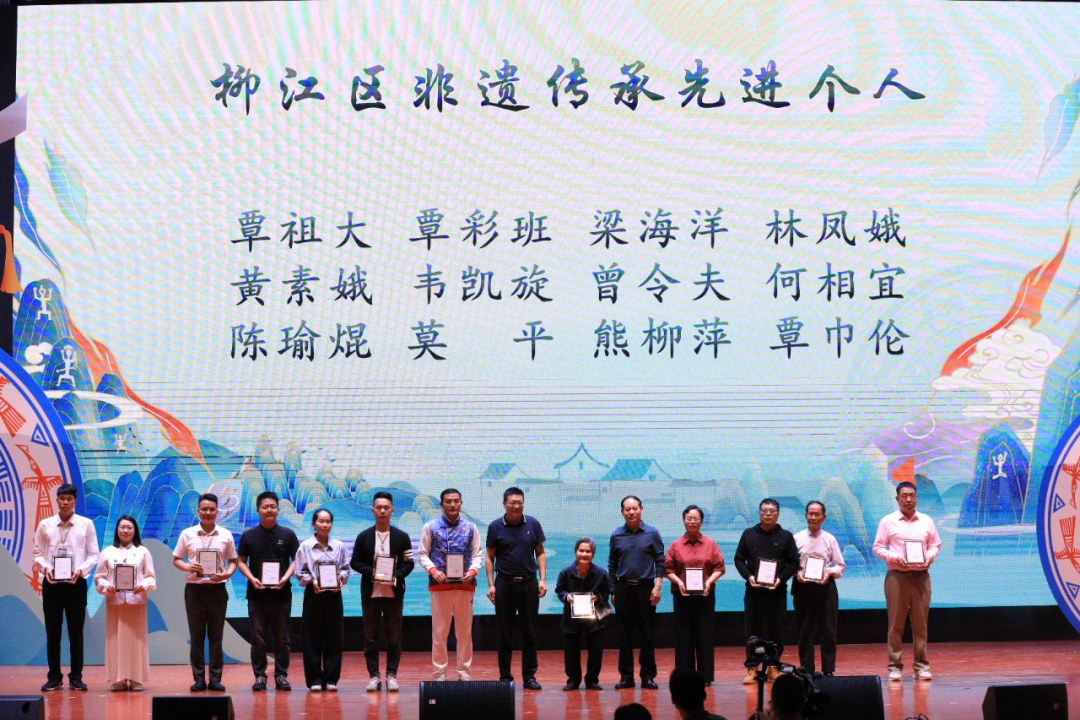 活动现场,来自柳江中学的师生们上演了自编自演的《高杆舞狮》、原创民俗舞蹈《猫狮舞》传统《五禽戏》等节目。除了文艺表演外,还表彰了12名柳江区2024年度“非遗传承先进个人”6名柳江区2024年度“非遗传承积极分子”。