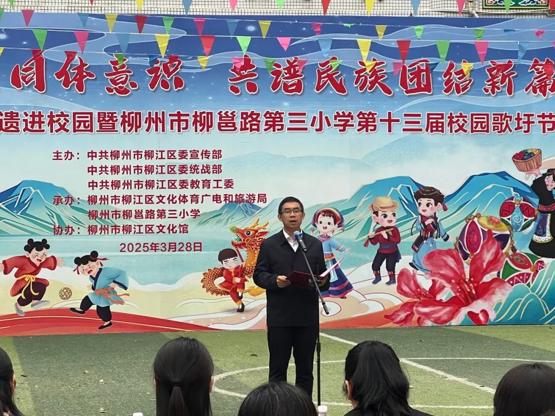 3月28日上午,由柳江区文化体育广电和旅游局承办,柳江区文化馆协办的2025年柳州市柳江区非遗进校园暨柳州市柳邕路第三小学第十三届校园歌圩节在校园内隆重开幕。本次活动不仅展示了丰富多彩的本土非遗文化,同时也通过校园歌圩节这一平台,弘扬和传承了民族文化,增强了民族团结和教育的文化自信。