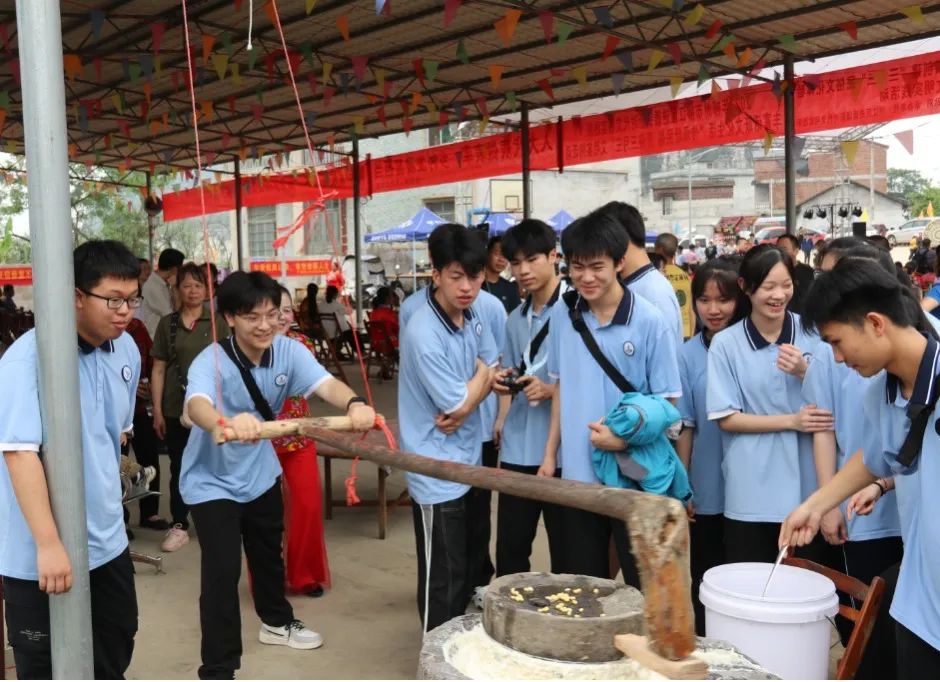 台上歌舞飞扬,台下欢声笑语。而在观众席后方的文化长廊,磨豆腐、打糍粑、做青团等民俗活动让游客争先恐后地参与、体验。夕阳西下,热闹的小山村升起炊烟。夜幕降临,村民与游客在操场上共进晚餐。土鸡土鸭,ngao肉血肠,一桌桌富原汁原味、香飘四溢而有壮乡特色的农家菜肴将村民和游客的心拉得更近。