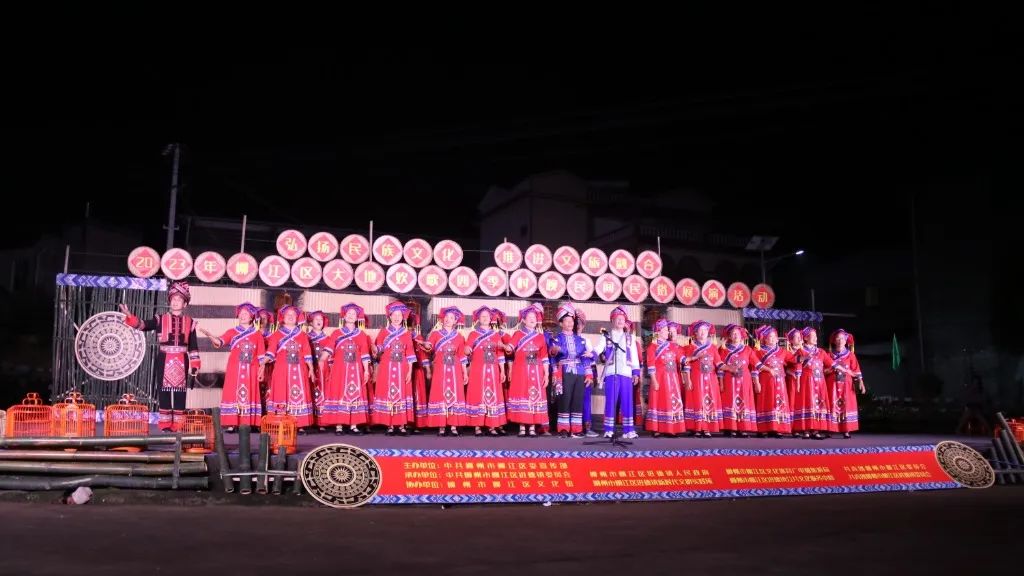 晚上7点半,一场丰富多彩的晚会——“大地欢歌·四季村晚”民间民俗文艺演出正式上演。区委常委、宣传部部长黄馨和进德镇党委书记曾澧分别上台致辞。身着壮族服装的合唱队放开歌喉,《欢歌新时代》。