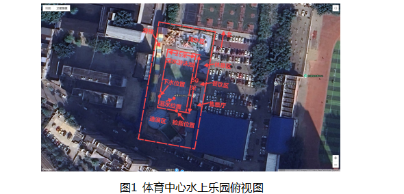 事故发生在柳州市柳江区拉堡镇南大街149号体育中心水上乐园深水游泳池内,该游泳池长50米、宽25米,水面面积1250平方米,水深1.4米-1.5米,未区分成人区和儿童区。体育中心水上乐园布局为:东侧:由南至北依次为售票厅→餐饮区→休息区,西侧:滑梯,南侧:造浪区,北侧:浅水区,中间:深水游泳池。事故地点位于深水游泳池内,距泳池的南边约10米、东边约12.5米位置。(见图1、见图2)