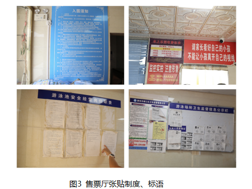 体育中心水上乐园售票厅内张贴《入园须知》、《游泳池安全经营岗位职责》、《游泳场所卫生监督信息公示栏》等制度,“请家长看好自己的小孩不能让小孩离开自己的视线”标语。(见图3)