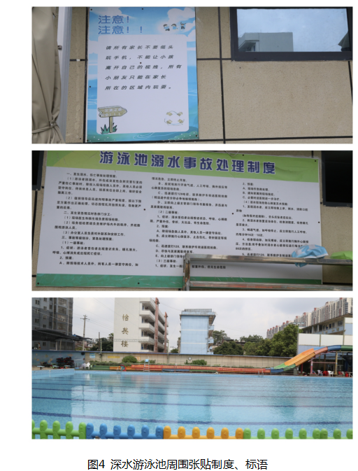 深水游泳池东侧的墙上张贴“请所有家长不要低头玩手机,不能让小孩离开自己的视线,所有小朋友只能在家长所在的区域内玩耍”标语、《游泳池溺水事故处理制度》,西侧悬挂“标准泳池规定:本区域水深1.4米-1.5米,儿童需在监护人的看护下方可入内,游客必须听从工作人员的管理和指挥,严禁在池内打闹、打水仗、跳水及在池内边吸烟或饮食”横幅。(见图4)