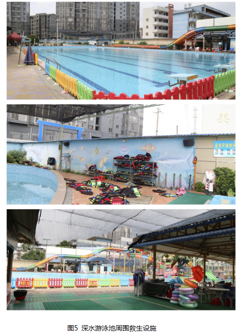 深水游泳池设置了4个救生观察台,在深水游泳池西南角(造浪区附近)放置有救生衣、东北角(休息区)放置有游泳圈。(见图5)