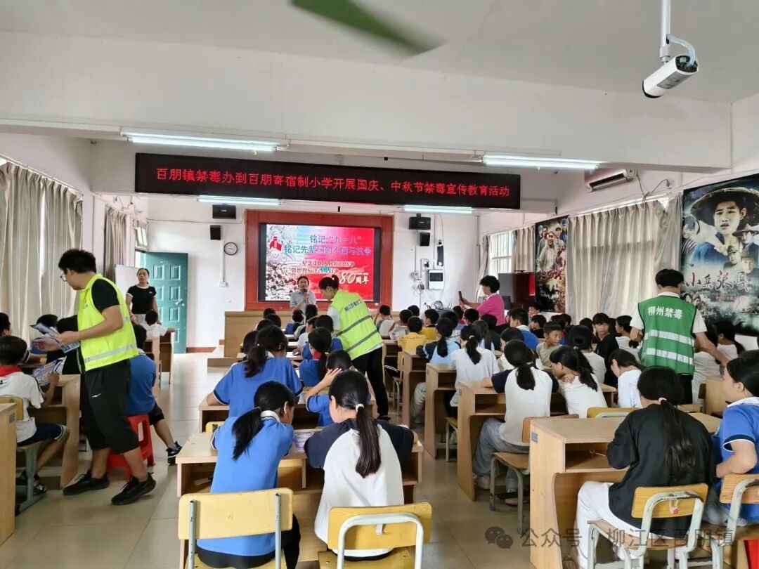 在国庆、中秋双节来临之际,为进一步加强校园禁毒宣传教育力度,提高青少年学生识毒、防毒、拒毒的意识和能力,筑牢校园禁毒防线,9月30日,百朋镇禁毒办组织禁毒社工分组联动,深入辖区内百朋中学、百朋中心小学及百朋寄宿部小学,开展了一系列形式多样、内容丰富的禁毒主题宣传活动。
