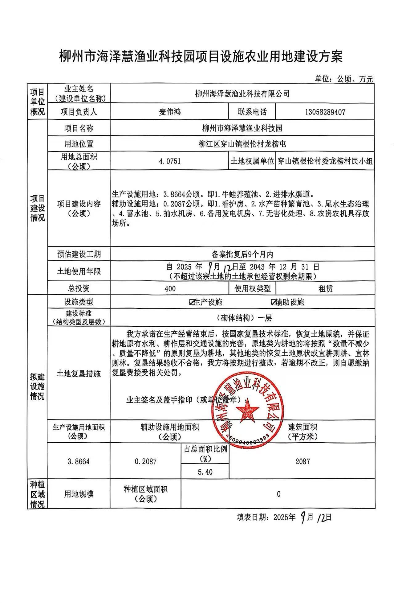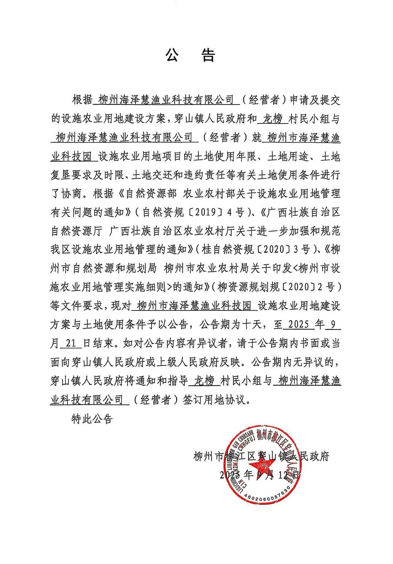 【穿山镇】柳州市海泽慧渔业科技园设施农业用地项目公告