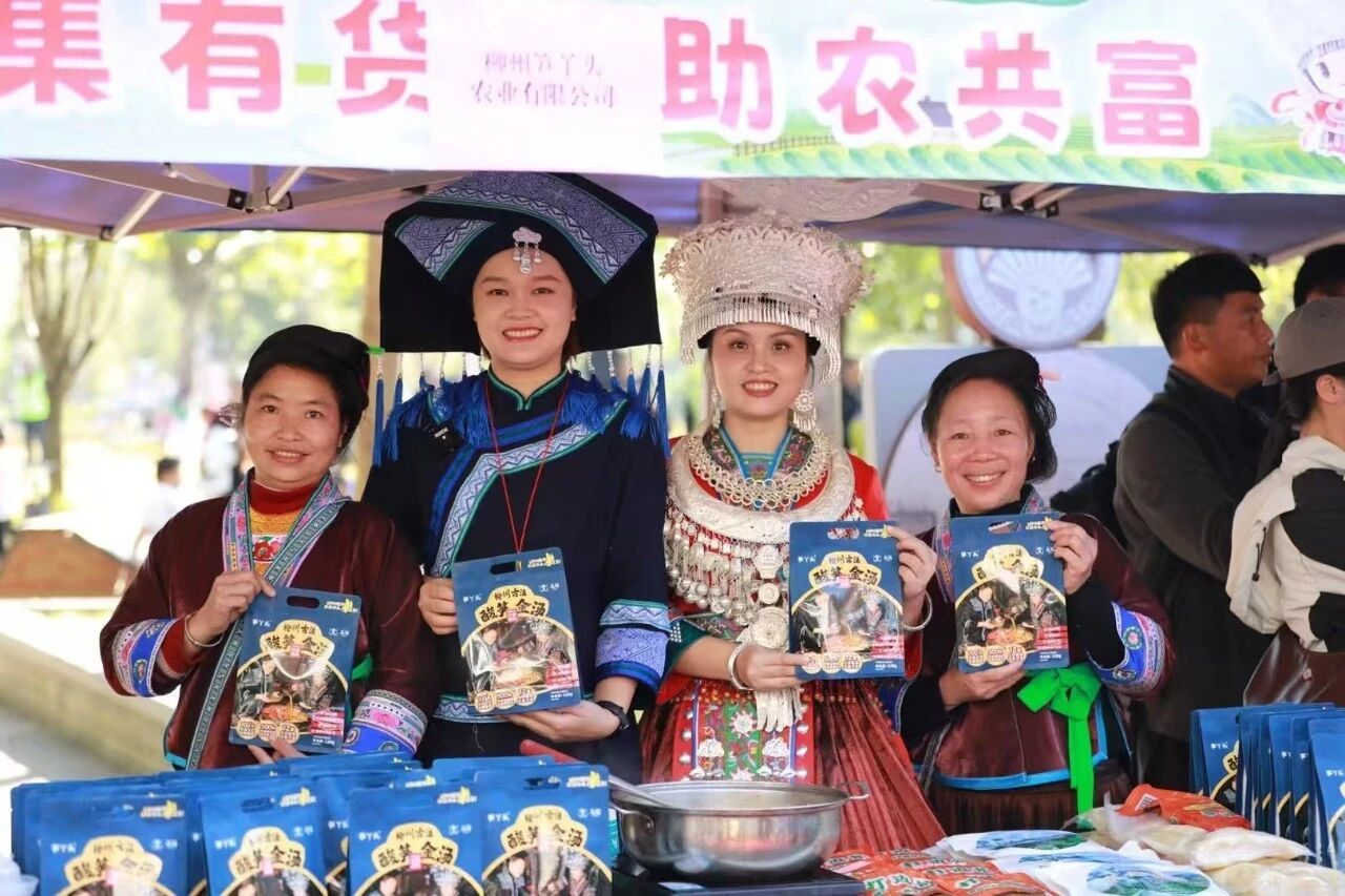 ↑ 在融水——柳江区域协作助力乡村振兴特色农产品发布会上,乌英苗寨妇女梁足英(左一)、吴妹富(右一)和帮扶企业负责人在展示合作推出的酸笋金汤(11月15日摄)。