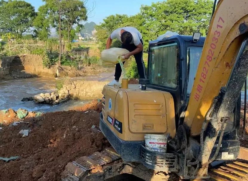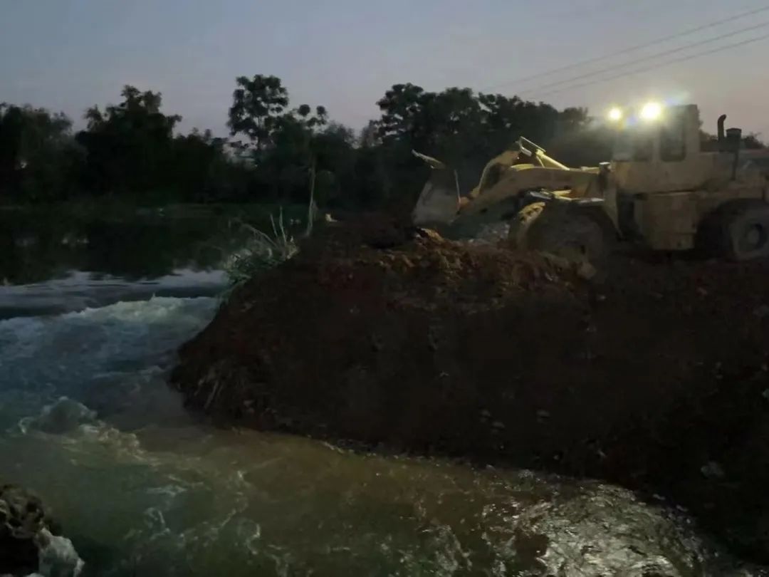 7月12日,抢修队顶着高温烈日,调来挖机、铲车开始动工,上午储备土方,下午开始回填。随着坝体缺口收紧,水流就越来越湍急,土方流失量就越大,修复施工难度就越大。在施工队持续奋战9个多小时后,直到晚上9点,被冲垮的坝体才得到修复。