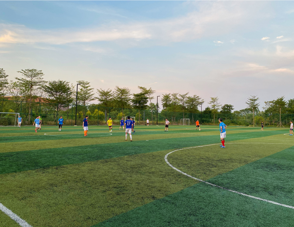 傍晚体育公园,家长带来小孩打球,遛狗的人看着小狗勾在草地上撒欢儿和新朋友贴贴……
