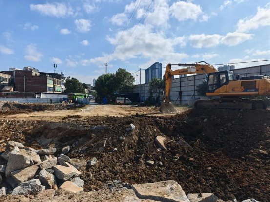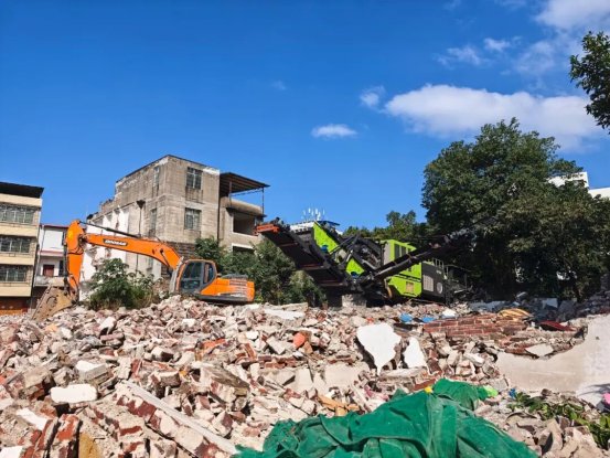 拆除现场堆积的瓦砾碎石等大体积建筑垃圾,正在由前几日入场的大型工程机械进行持续粉碎作业,便于后期开展垃圾清运并全面腾空路面,推进新路网施工建设。