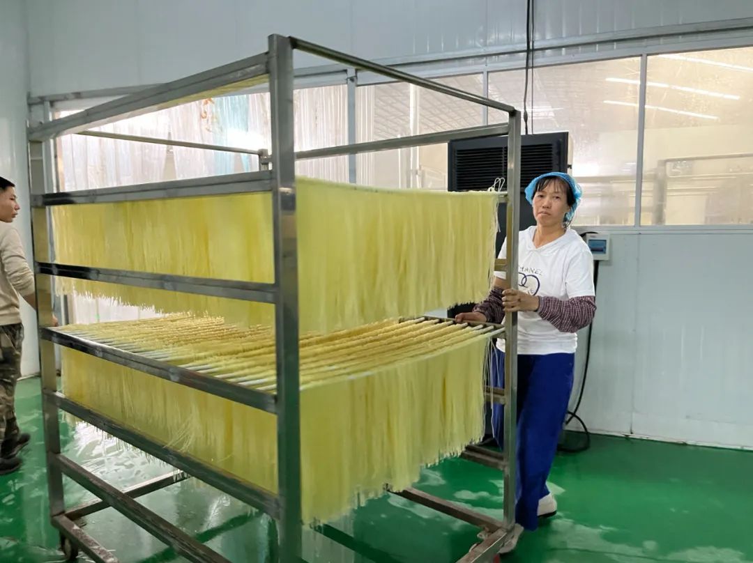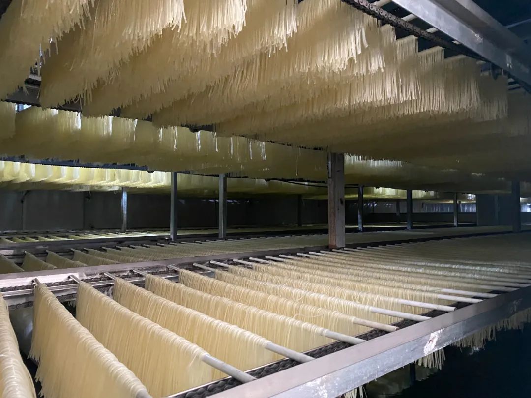 烘干车间中,鲜米粉经过灭菌、脱水等系列工序,逐渐变得干燥鲜香,风味进一步被激发,让人恨不得直接烧水开嗦。