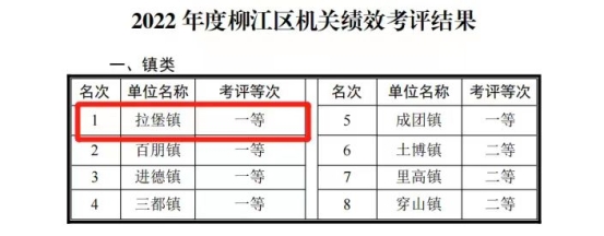 2022年,拉堡镇在区委、区政府的领导下,圆满完成各项中心工作,各项事业迈上新台阶。获评“西部百强镇”;2个党组织获评自治区城市居民小区五星级党组织,是全市获评最多乡镇 (街道);人大代表联络站获自治区先进集体;连续两年获柳州市征兵工作先进集体。