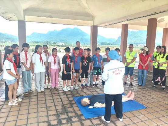 随着夏季高温天气持续,未成年人溺水事故进入高发期。结合本次研学活动,志愿者通过案例分析与互动问答,向孩子们传授防溺水安全常识,包括“六不两会”等安全注意事项及正确呼救方法。卫生院医护人员现场示范溺水急救方法,手把手指导孩子们进行心肺复苏操作练习,让他们掌握基本急救技能,提升安全防范意识和应对能力。