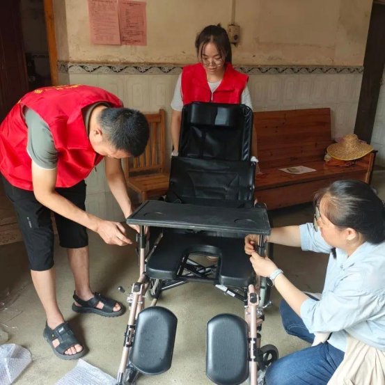 志愿者将崭新的轮椅送到三都社区、觉山村、三都村的3位行动不便的村民家中,并现场组装好辅助器具,讲解相关使用注意事项。残疾人家属覃女士感激地说:之前我们是借别人的旧轮椅,很多地方已经磨损了。感谢你们送来了新的轮椅,太及时了!