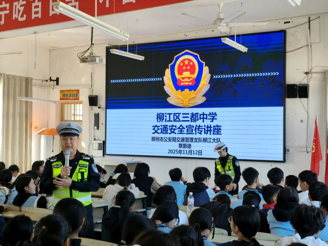 讲座现场,柳江交警大队民警覃振德结合青少年出行特点,通过典型案例剖析、互动问答等形式,生动讲解骑行、乘车等日常出行的安全注意事项。重点强调了闯红灯、骑行电动车不戴头盔、乘坐黑车出行等危险行为的危害,引导同学们自觉遵守交通法规,养成文明出行习惯。