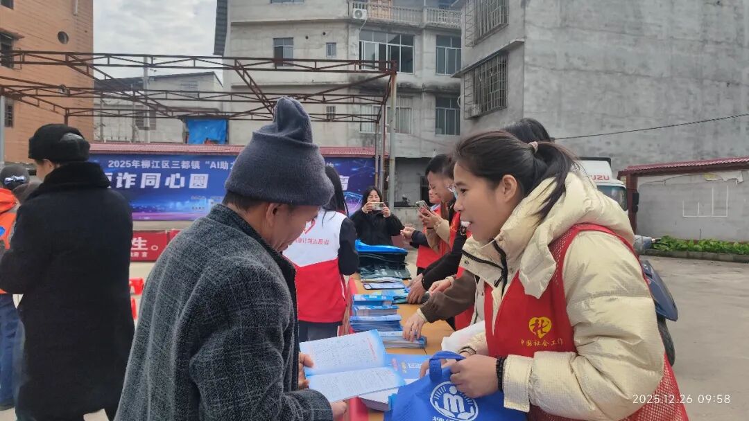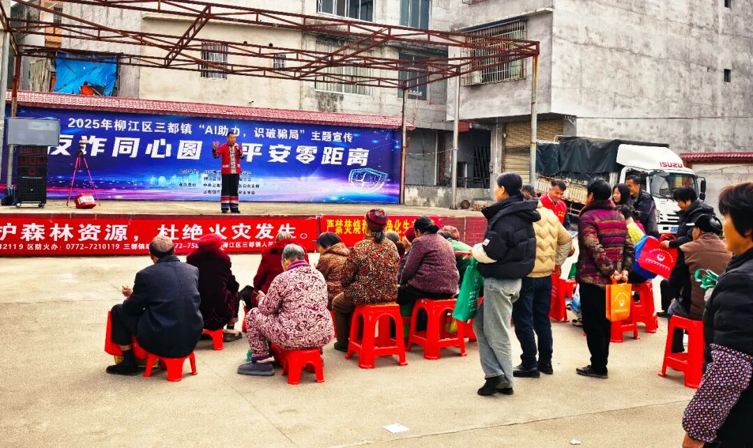 12月26日,正是三都街的赶圩日,一场“AI助力,识破骗局”反诈主题宣传活动在三都街百优超市前热闹开场。此次活动由柳江区社会科学界联合会,三都镇党委、政府主办,三都社区承办,三都派出所、广西农村合作银行三都支行等单位携手参与。