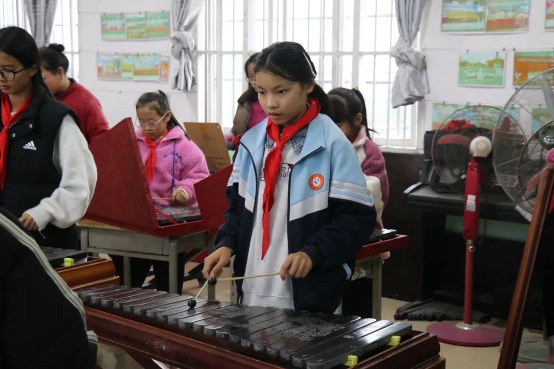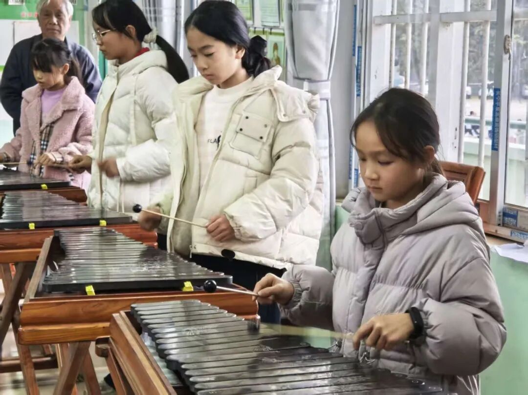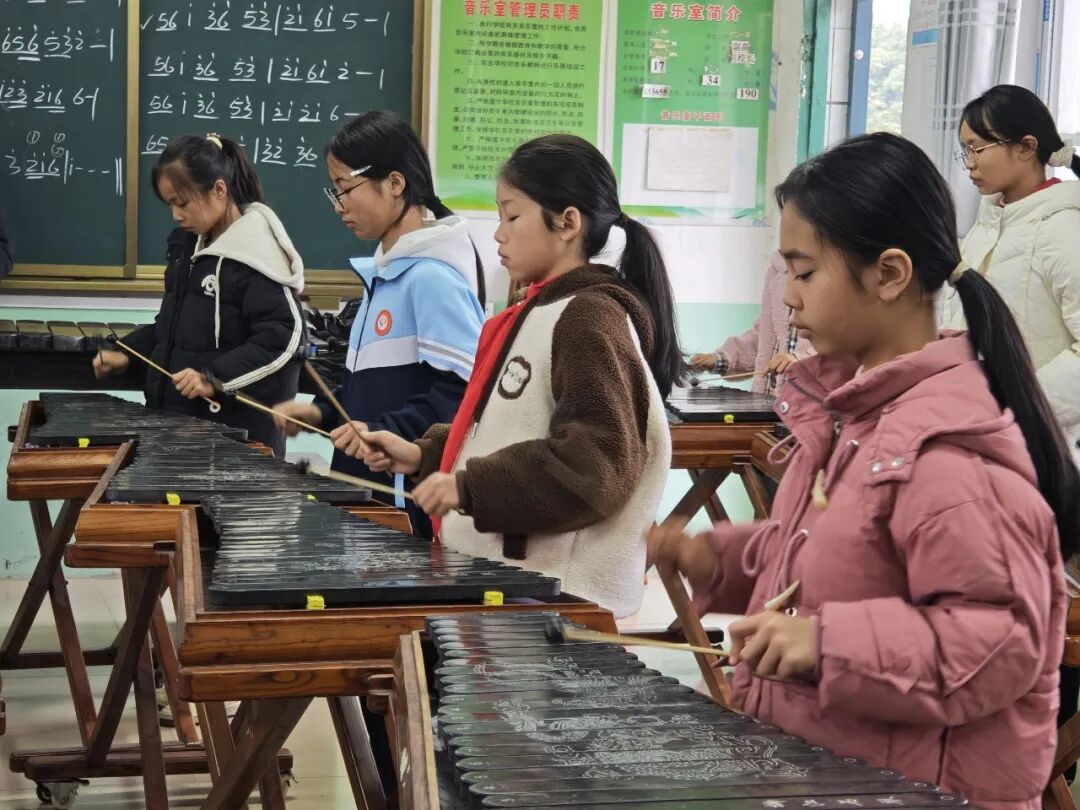 这是他们指导三都中心小学石琴社团的第二个月,现场排练的正是韦彬林老师根据石琴的高、中、低三个声部改编的石琴版《刘三姐》乐谱。为了更好地教学,他们还邀请了两位经验丰富的钢琴老师前来助阵。“石琴,作为我们三都镇的宝贵特色文化,能够将其薪火相传,是我一直以来的心愿。”韦彬林看着孩子们专注合奏的身影,眼里满是欣慰的光。