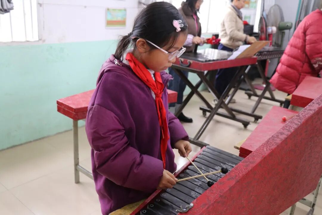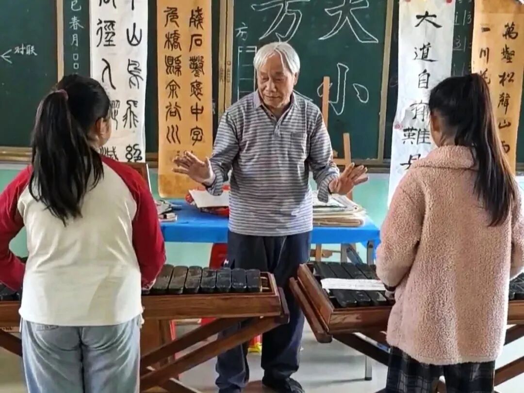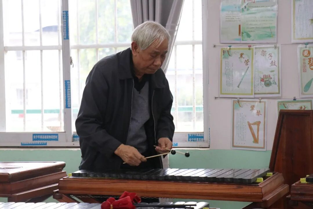 “叮叮咚咚……”一阵清脆悦耳的石琴声从三都镇中心小学的音乐教室传出,古朴悠扬的旋律在校园里回荡。石琴社团的老师正带着同学们排练《刘三姐》曲目。一旁,两位“有来头”的老师正认真观摩,时不时和老师同学们交流,他们是柳江石琴演奏和石琴制作技艺的非遗传承人——韦彬林、韦明章,韦彬林老师也是“五老”志愿者中的一员。