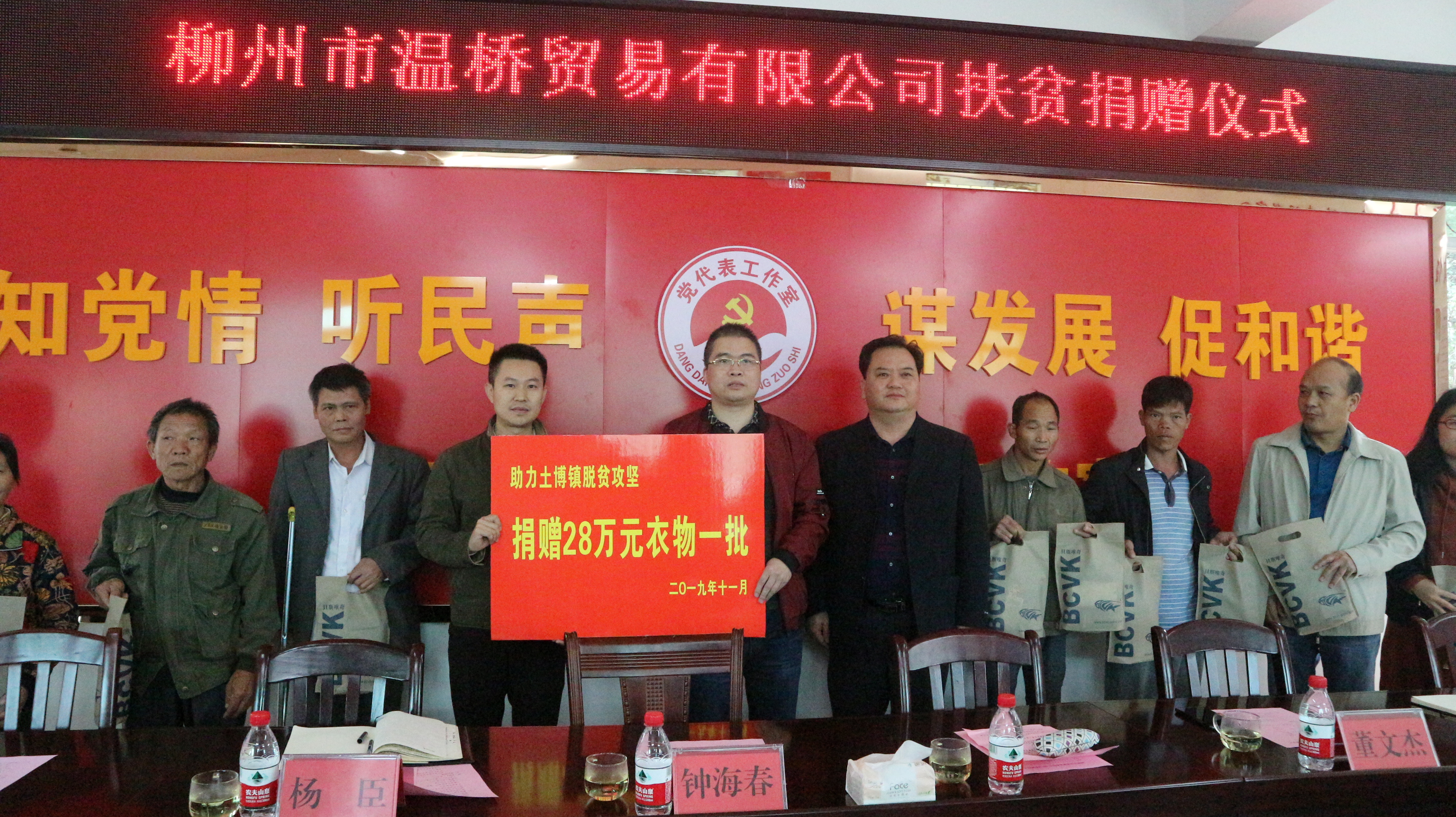 据悉,柳州市温桥贸易有限公司为土博镇建档立卡贫困户捐赠了价值28万元的衣物一批,公司代表表示,今后将继续关注扶贫帮困工作,为脱贫攻坚贡献自己的一份力量。