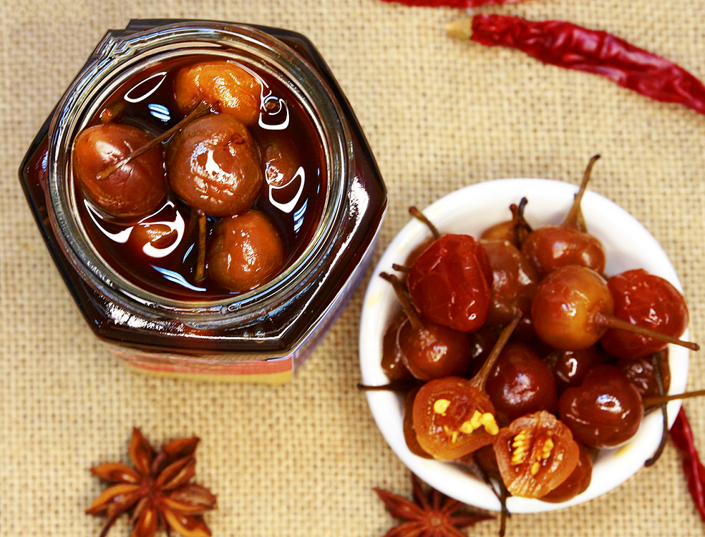 在夏天,炎热闷热,土博家庭中的长辈,总会为一家人煮好一锅白米粥,在碗中倒上几粒事先用花椒、八角、大蒜、黄豆酱油腌制的七彩椒,香、辣、酸、甜、脆五香合一,恰如其分。食过一口就难以停下来。早餐就馒头饺子越吃越香,中午来不急做菜,一个蛋炒饭配上几颗七彩椒,下饭开胃。七彩椒是土博人生活必不可少的一抹亮色,为平淡的食物注入灵魂。
