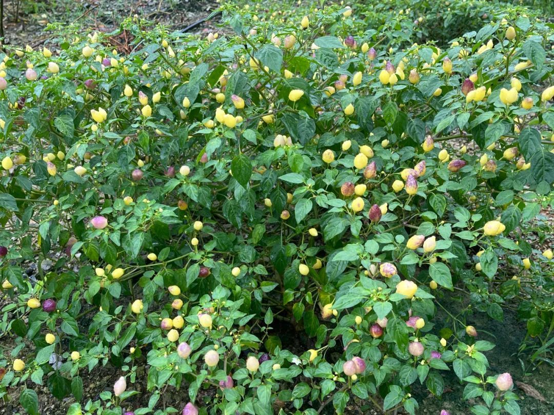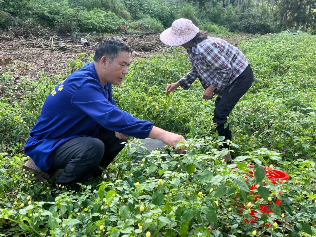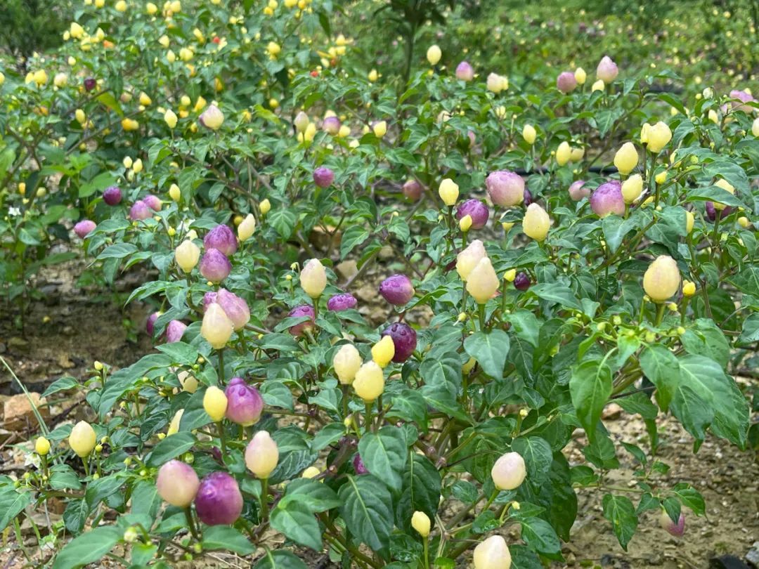 韦大姐动作娴熟,双指在枝叶间翻飞,很快就摘满了一筐。“现在正是五彩椒采摘的时候,我通常早上7点左右就开始下地干活。摘完了就直接拉到收购点卖掉。现摘现卖,新鲜着呢!收成好的时候,老板还会直接到地里收,省了我们不少工夫。”