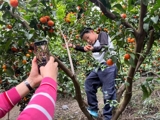 老人仔细挑选果实,孩子们蹦蹦跳跳穿梭林间,成年人抬手剪果,时不时拍照打卡留作纪念,欢声笑语回荡在橘园里。耐心的讲解、贴心的叮嘱,让哈尔滨游客倍感温暖,连连夸赞“广西老表太热情了!”