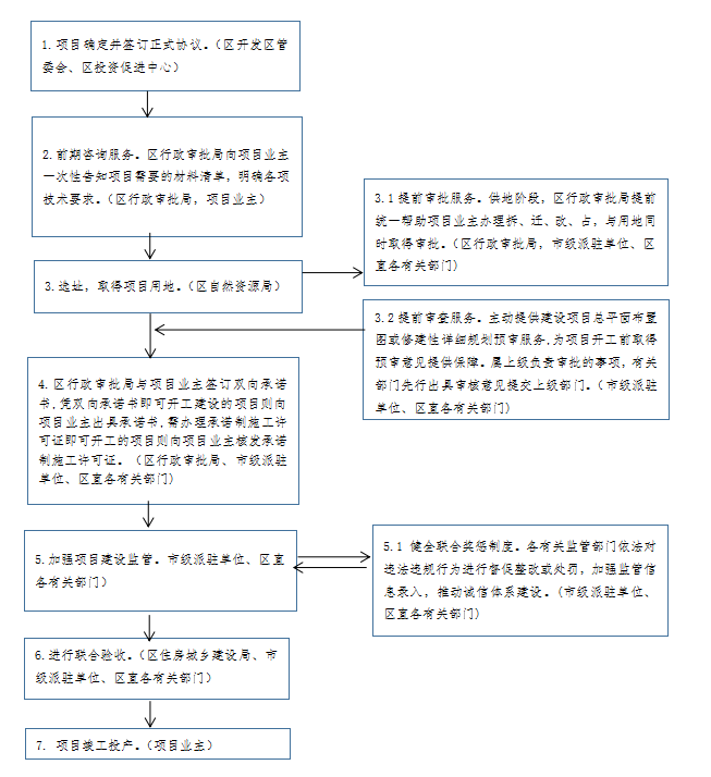 3. 实行提前审批服务。实行双容双承诺实现承诺即开工改革项目,实施提前介入、预审批、并联审批等措施,在土地报批阶段即进行行政审批。在供地阶段,原来由项目业主办理的事项改为由区行政审批局提供帮办、代办服务,项目业主取得土地同时获得审批结果。涉及帮办、代办事项为:绿地、树木审批,市政设施建设类审批,因工程建设需要拆除、改动、迁移供水、排水与污水设施审核,占用农业灌溉水源、灌排工程设施审批等。(牵头单位:区行政审批局,配合单位:市级派驻单位、区直各有关部门)