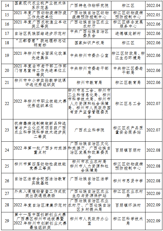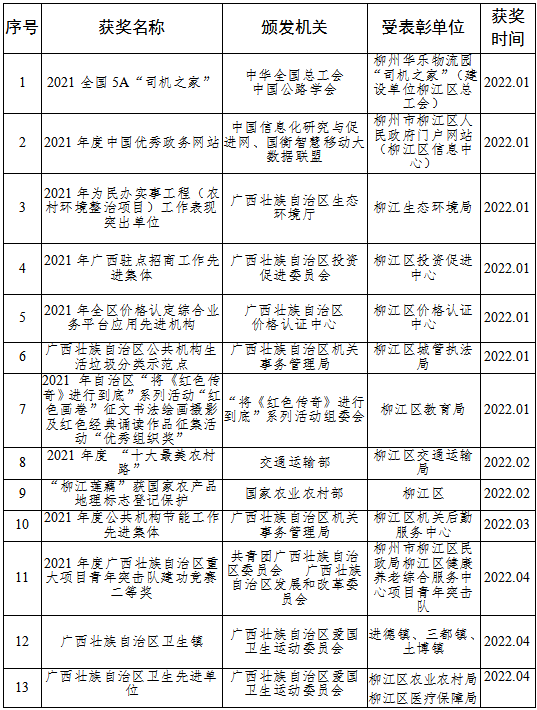 柳江区2022年荣获上级嘉奖表彰情况一览表