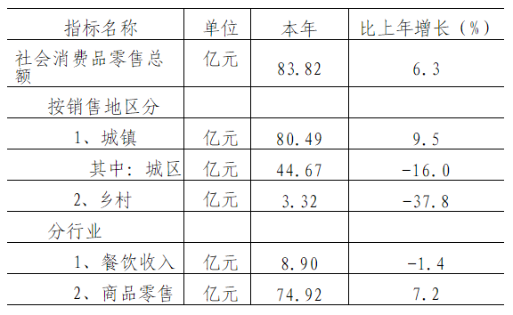 全年批发零售商品销售总额168.47亿元,比上年增长17.4%。社会消费品零售总额83.82亿元,增长6.3%。按销售地区分,城镇零售80.49亿元,增长9.5%,乡村零售3.32亿元,下降37.8%。分行业看,商品零售额74.92亿元,增长7.2%;餐饮收入8.90亿元,下降1.4%。(见下表3)