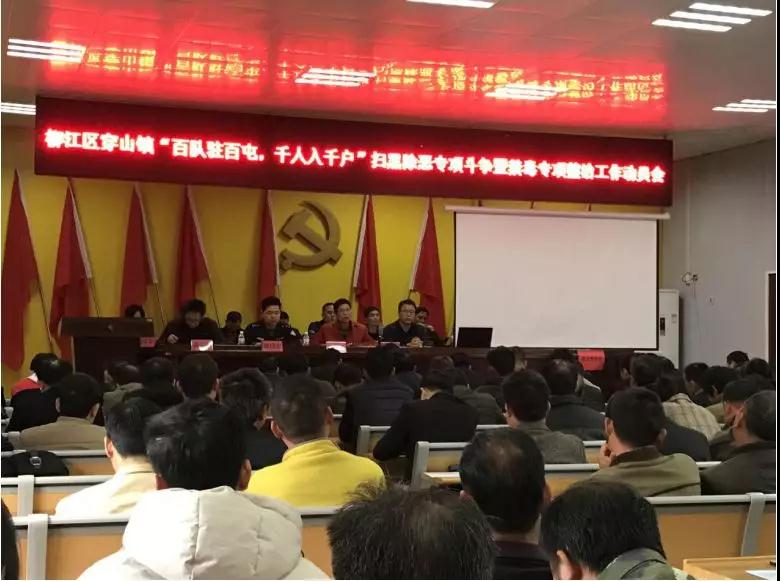为深入推进、贯彻落实习近平总书记关于扫黑除恶专项斗争的重要讲话精神,结合自治区、柳州市、柳江区2019年度禁毒工作开展要求,确保扫黑除恶专项斗争取得实实在在的成效,柳江区穿山镇结合创建柳江区吸毒人员管控示范乡镇活动,于2019年4月1日,召开“柳江区穿山镇'百队驻百屯、千人入千户'扫黑除恶专项斗争暨禁毒专项整治工作动员会”。