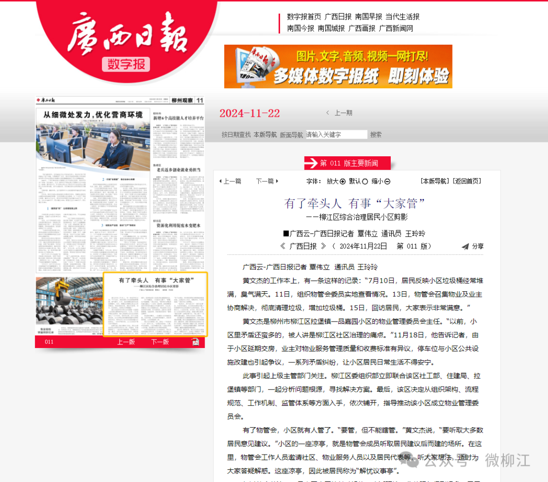 11月22日,《广西日报》刊发稿件《有了牵头人 有事“大家管”——柳江区综合治理居民小区剪影》,展现柳江区以党建引领,多部门联动,综合治理居民小区成效,构建城市基层治理新格局。