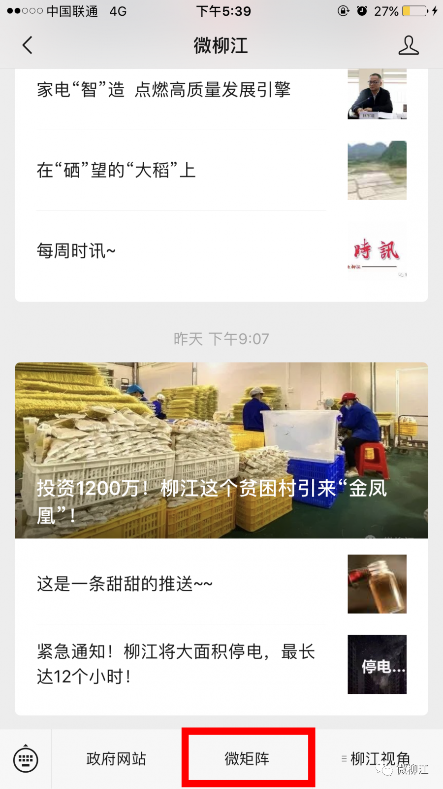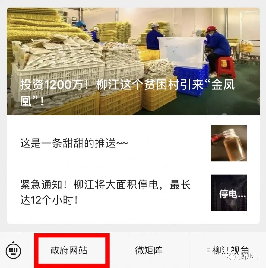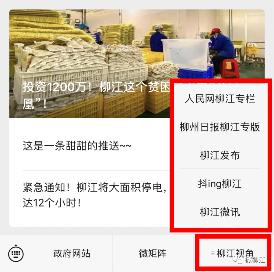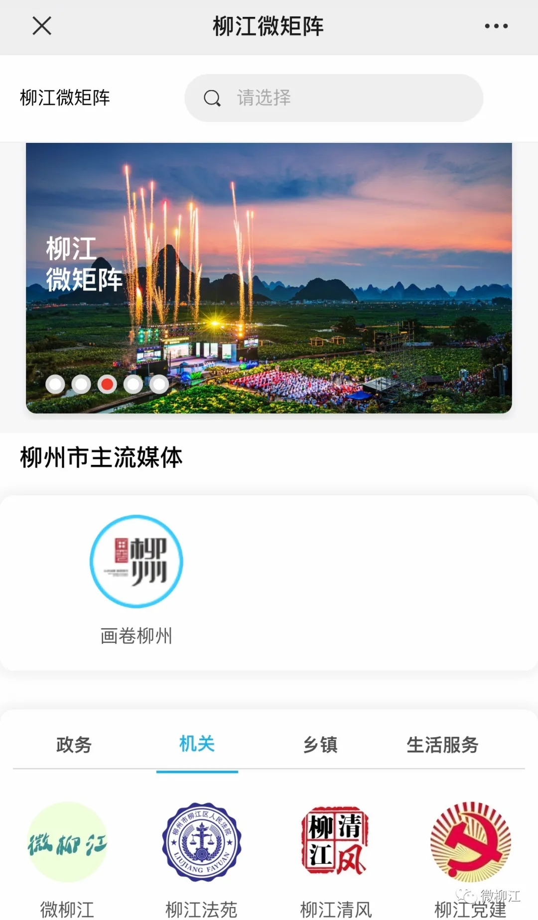 进入微柳江官方微信公众号,点击下方“微矩阵”菜单栏,进入页面,即可一览柳江区政务、主要机关、各乡镇以及相关服务内容公众号,了解最新信息。