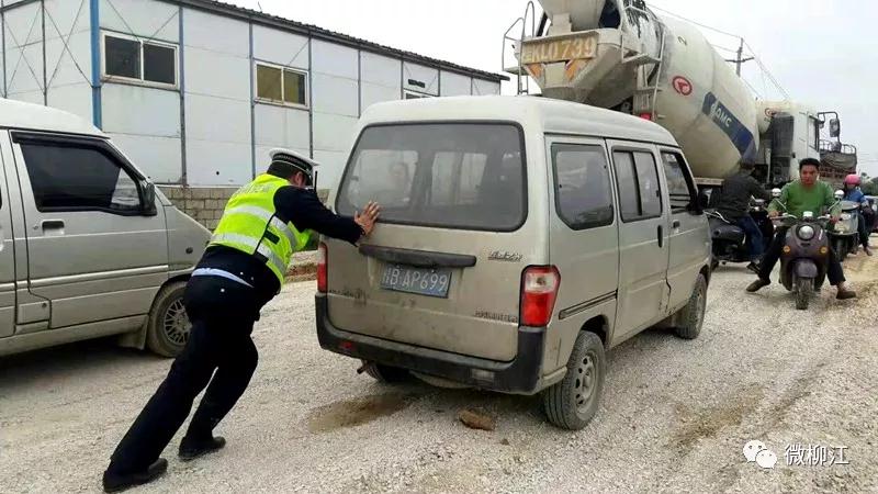 在柳江大道连接白莲大道的辅道上,道路施工泥泞坑洼,一辆灰色高顶篷小客车死火卡在路中,司机正手足无措傻呆车旁时,在该路段疏导交通的交警于江龙走过来,二话不说,撸起袖子给该司机做起了推车工人,把车往前推几十米,直至车辆脱困,司机还未来得及说声谢谢,交警已步入车流中疏导其它受堵车辆。