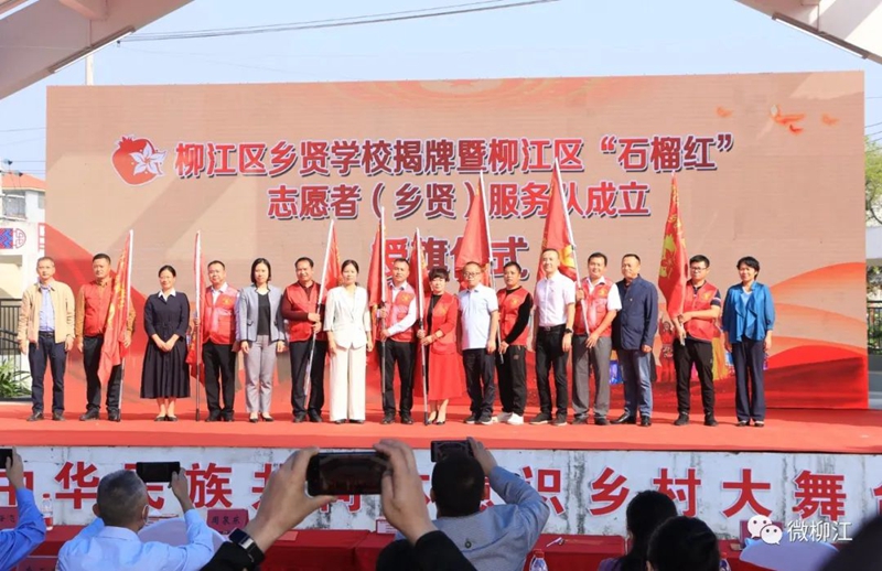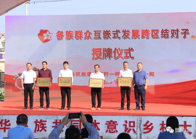活动上,与会领导共同为柳州市柳江区乡贤学校揭牌,并为柳江区“石榴红”志愿者(乡贤)服务队授旗;柳江区与忻城县、柳北区进行各族群众互嵌式发展跨区结对子授牌,进一步加强民族地区资源互补,形成区域协调发展、共同发展的良好局面。