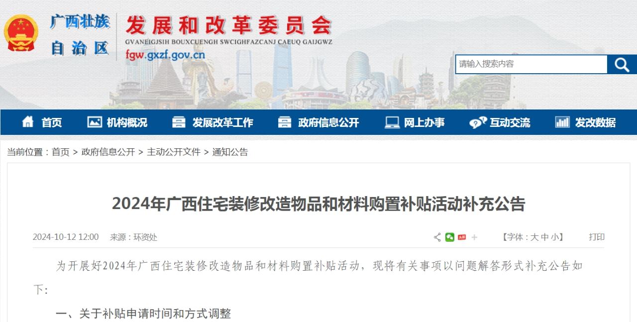 10月12日,自治区发展改革委发布补充公告,2024年广西住宅装修改造物品和材料购置补贴的申请时间和方式有调整,原计划线下人工申报方式,统一调整为线上申报(通过云闪付App申报)。申请人在手机下载云闪付App,自10月21日8时起,可通过云闪付App填报提交申请材料。