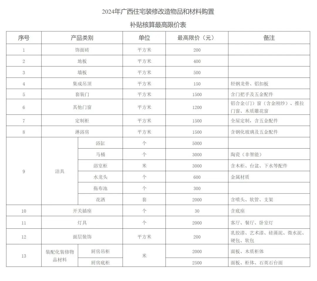 2024年广西住宅装修改造物品和材料购置补贴活动期间,对个人消费者委托装饰装修公司装修的,按照消费者与装饰装修公司签订合同中的单套住宅家装物品和材料总价款的20%给予一次性补贴,最高不超过3万元;