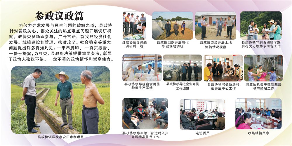 几年来,每年都开展3-4个课题的调研、视察活动,并形成书面报告呈县委县政府,为促进问题的解决献计献策