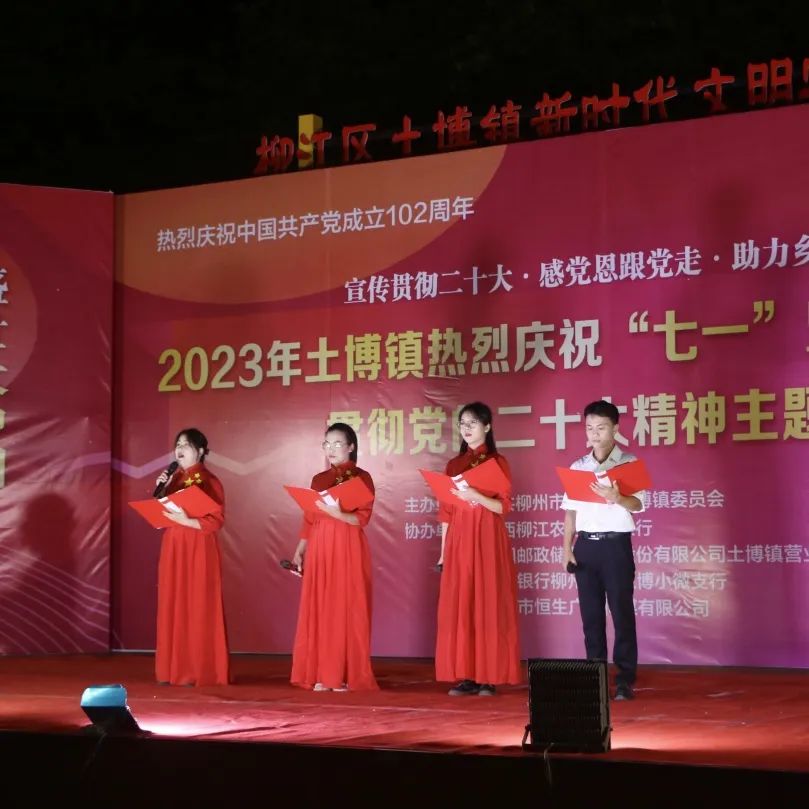 文艺演出以独特的视角和方式,采用歌舞、渔鼓、三句半、朗诵、快板等多种艺术形式为载体为观众带来一场视觉与听觉的盛宴,展现我们党102年的辉煌历程和丰功伟绩,表达我们对党的无限热爱和崇高敬意。土博镇党委书记潘陆建首先为晚会致辞,他简要回顾了党的光辉历程,激励全镇党员干部传承红色基因、更加团结奋斗建设美丽富裕新土博。来自土博文艺队的舞蹈《没有共产党就没有新中国》拉开了晚会的序幕,来自土博镇机关、事业单位党支部的红色诵读《彩色的中国》、《锦绣》、《月光下的中国》、《精神的力量》以饱满的激情歌颂伟大祖国繁荣昌盛,也阐述了自己的理想和追求,充分表达扎根基层、服务群众的坚定信念,同时也充分展现了广大党员青年朝气蓬勃、务实进取、多才多艺的良好精神风貌,博得了观众们的一致好评,现场内时时爆发出热烈的掌声。来自民间文艺队的快板《歌颂党的二十大》、现代戏《四季顺》、桂林渔鼓《小康路上大步跨》、渔鼓《脱贫致富感谢党》、三句半《党的二十大精神来指引》等节目,各具特色,精彩纷呈,使整场晚会达到了高潮。晚会历时2个小时,最后在全体演员、观众齐声合唱《没有共产党就没有新中国》的高亢歌声中圆满结束。