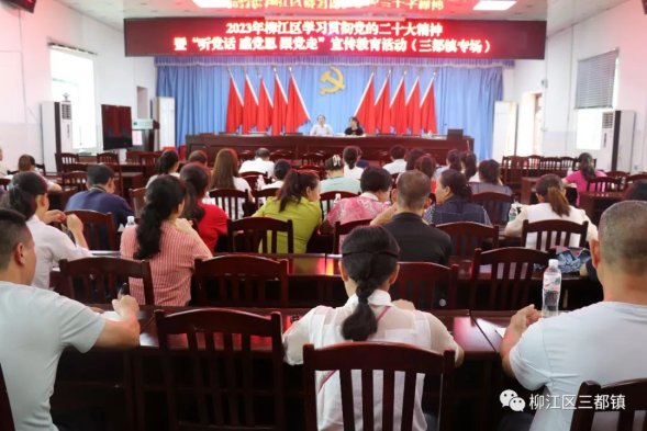 为深入学习宣传贯彻党的二十大精神,学习贯彻习近平总书记关于“三农”工作的重要论述,大力弘扬模范代表杨宁的先进事迹,7月4日上午,柳江区学习贯彻党的二十大精神暨“听党话 感党恩 跟党走”宣讲活动三都镇专场在镇大礼堂召开,在镇领导班子成员、镇政府党总支部党员、各村驻村第一书记、驻村工作队员、村“两委”干部参加宣讲报告会。
