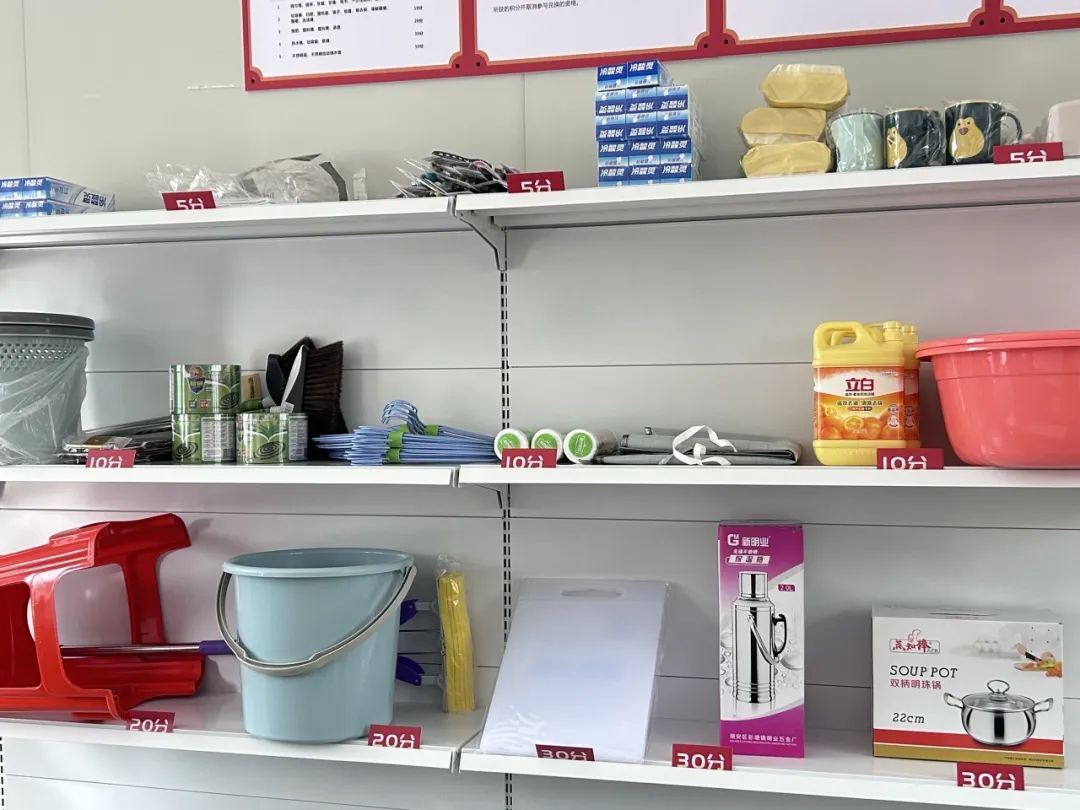 这是设在定山村委的“积分超市”,面积虽然不大,货架上的物品却不少,毛巾水杯、牙膏牙刷、纸巾等各类生活用品一应俱全。与普通超市不同的是,这里的商品不能用钱买,只能用积分兑换。墙上贴着获取积分条件和兑换表,上面标注着兑换各种物品和服务所需的积分,评分标准一目了然。