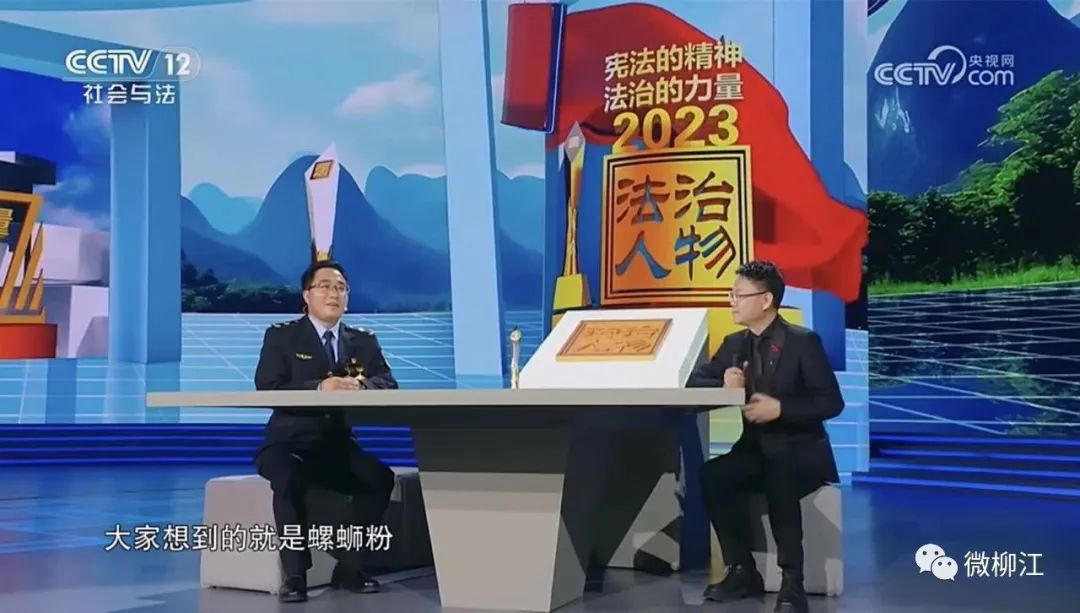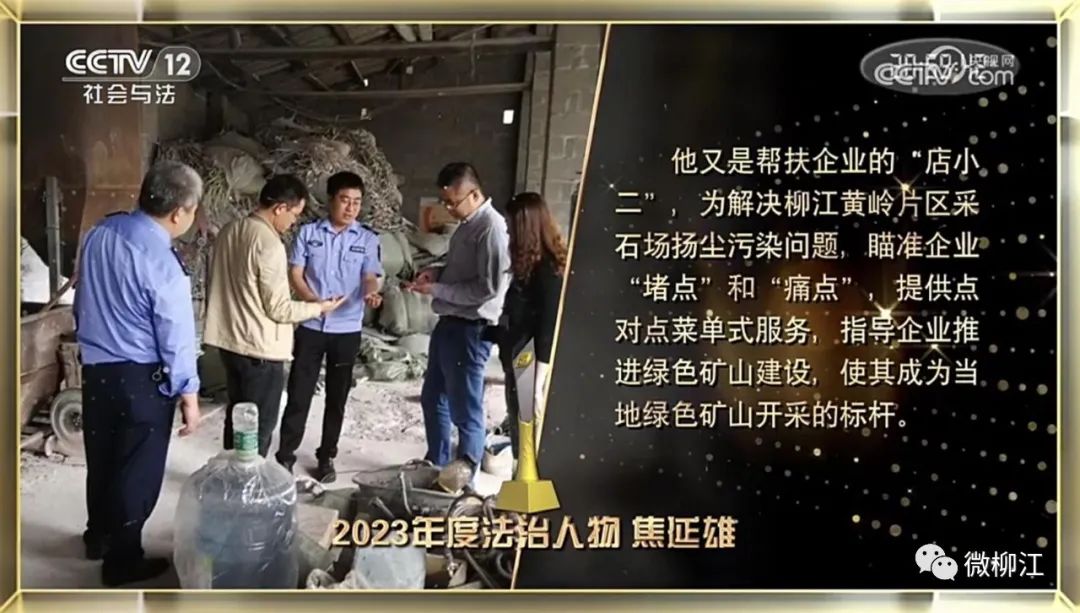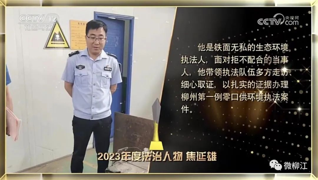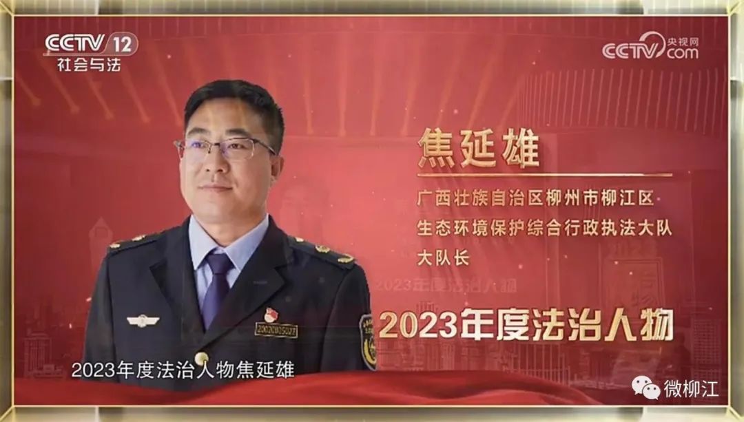 12月4日是第十个“国家宪法日”,当晚,《宪法的精神 法治的力量——2023年度法治人物》节目在央视综合频道和社会与法频道播出,该节目向全社会揭晓10位“2023年度法治人物”和3位“2023年度致敬英雄”。其中,柳江区生态环境保护综合行政执法大队大队长焦延雄荣获“2023年度法治人物”,在节目中讲述他14年坚守柳州生态环境执法一线的感人故事。